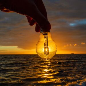 man-holding-umbrella-by-sea-against-sky-sunset