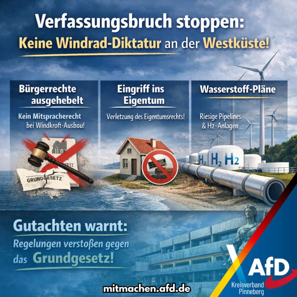 Habecks Verfassungsbruch stoppen: Keine Windrad-Diktatur an unserer Westküste!Während sich die Funktionäre in der Kreisverwaltung Pinneberg treffen, um über die „Energieküste 2040“ zu schwadronieren, kommt jetzt der Paukenschlag: Die juristische Grundlage für diesen massiven Umbau ist laut einem neuen Gutachten verfassungswidrig!. Das Gutachten des Experten Volker Boehme-Neßler entlarvt die „Machenschaften“ der Ära Habeck: Das Grundgesetz wurde für die grüne Ideologie einfach beiseitegeschoben!Was in unserer Heimat hinter verschlossenen Türen passiert:Bürgerrechte ausgehebelt: Durch Habecks EEG-Änderung wurde die Windkraft zum „überragenden öffentlichen Interesse“ erklärt. Das bedeutet: Echte Abwägungen und Mitsprache der Bürger finden nicht mehr statt – das Ergebnis steht schon fest, bevor überhaupt gefragt wird!Angriff aufs Eigentum: Das Gutachten stellt klar: Habecks Norm verletzt unser Grundrecht auf Eigentum massiv!Der „Wasserstoff-Wahnsinn“ rollt: Was mit Windrädern begann, soll jetzt auf Wasserstoff-Anlagen und Pipelines ausgeweitet werden. Der Städte- und Gemeindebund warnt bereits vor einer „inflationären Verwendung“ dieser Vorrangregeln, die unsere kommunale Selbstverwaltung zerstört!Fakten schaffen ohne Volk: In Elmshorn wird über „strategische Leitlinien“ bis 2040 diskutiert, während die Bürger durch verfassungswidrige Gesetze faktisch mundtot gemacht wurden. Ob Windpark-Wildwuchs oder neue Pipeline-Trassen. Sie sollen nur noch zusehen!Wir sagen: Schluss mit dem demokratiefreien Turbo-Ausbau! Unsere Region ist kein Spielplatz für Berliner Ideologen, die das Grundgesetz nur als Empfehlung betrachten. Schleswig-Holstein braucht Energiepolitik mit Recht, Ordnung und echtem Bürgerwillen!Haben Sie von der Konferenz in Elmshorn gehört? #AfD #Elmshorn #Pinneberg #Steinburg #Energieküste #HabeckStoppen #RechtsstaatBewahren #MutZurWahrheit